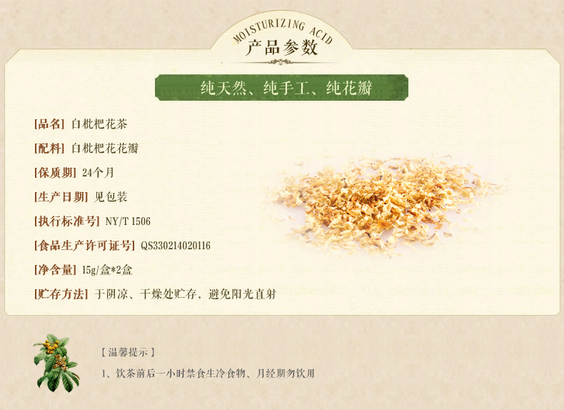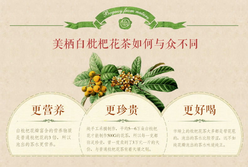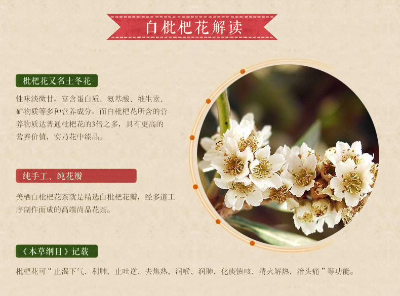 枇杷花茶含有人体所需的18种氨基酸以及维生素C、抗衰老素等营养元素,尤其是人体必需的核酸、维生素、Ca、Zn和Fe等8种矿质成分氨基酸含量均较高和三萜皂甙等多种药用成分。具有独特的保健作用。
