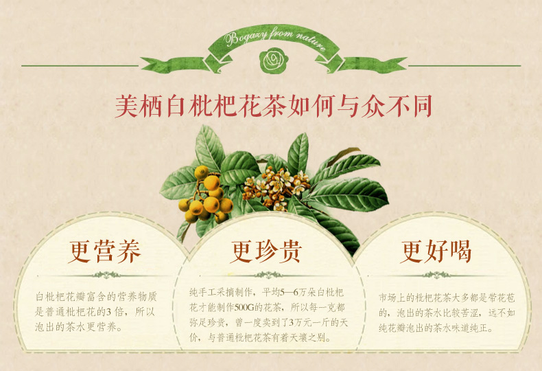 枇杷花茶含有人体所需的18种氨基酸以及维生素C、抗衰老素等营养元素,尤其是人体必需的核酸、维生素、Ca、Zn和Fe等8种矿质成分氨基酸含量均较高和三萜皂甙等多种药用成分。具有独特的保健作用。