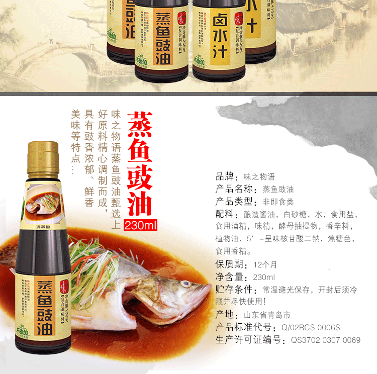 味之物语蒸鱼豉油甄选上好原料精心调制而成,具有鼓香浓郁,鲜香味美等特点