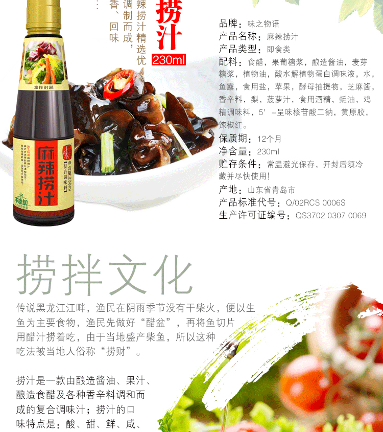 味之物语 麻辣捞汁230ml凉拌汁调味汁凉拌海鲜水果沙拉 麻辣爽口