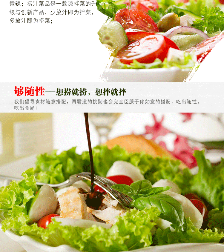 捞汁菜品是一款凉拌菜的升级与创新产品,少放汁即为拌菜,多放汁即为捞菜,想捞就捞,想拌就拌!