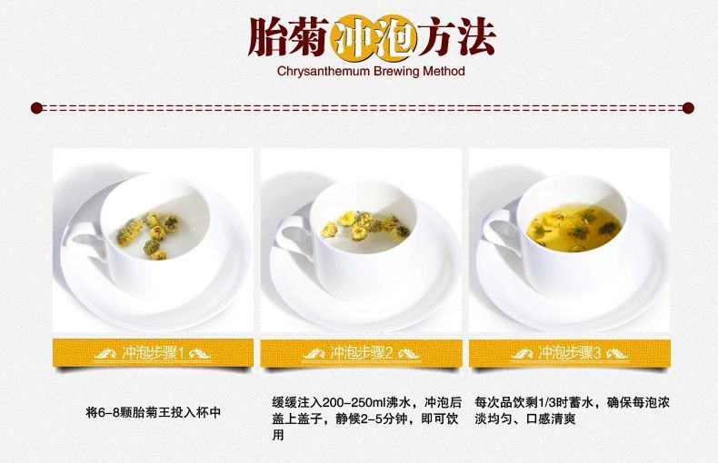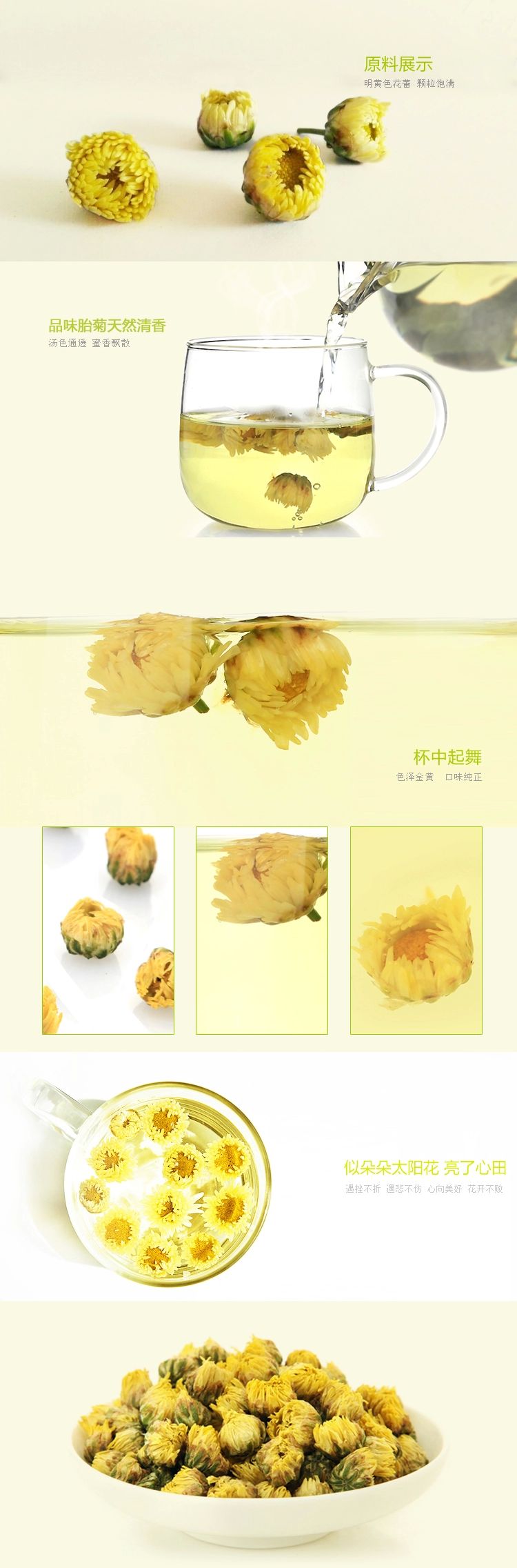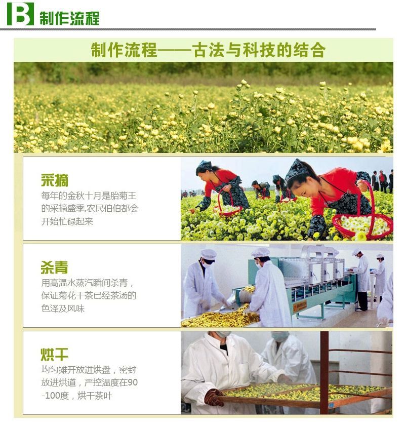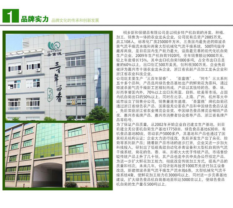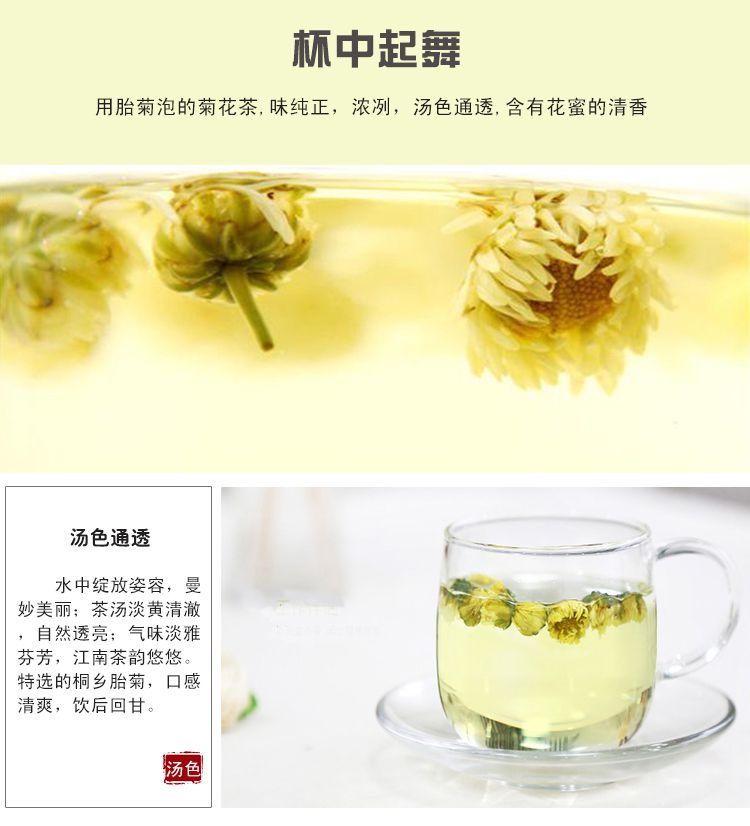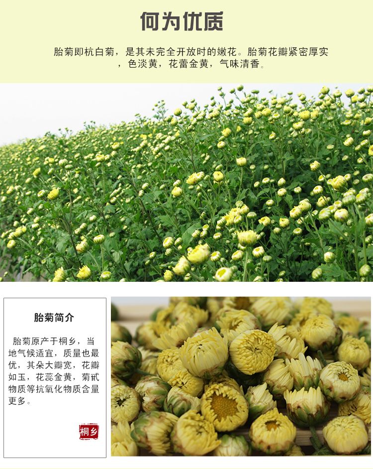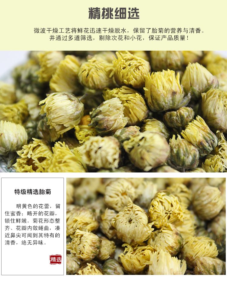 胎菊为每年秋霜之前,摘取我公司绿色食品基地出产的头道杭白菊之初蕾,经微波杀青气流干燥新工艺精制而成,