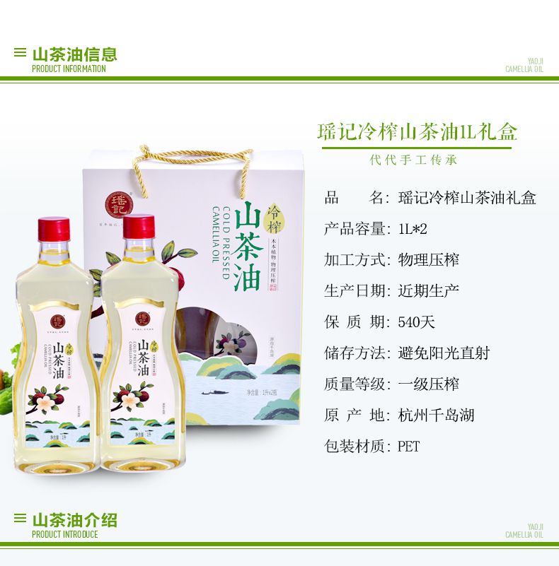 【瑶记】杭州特产 物理冷榨山茶籽油1L*2