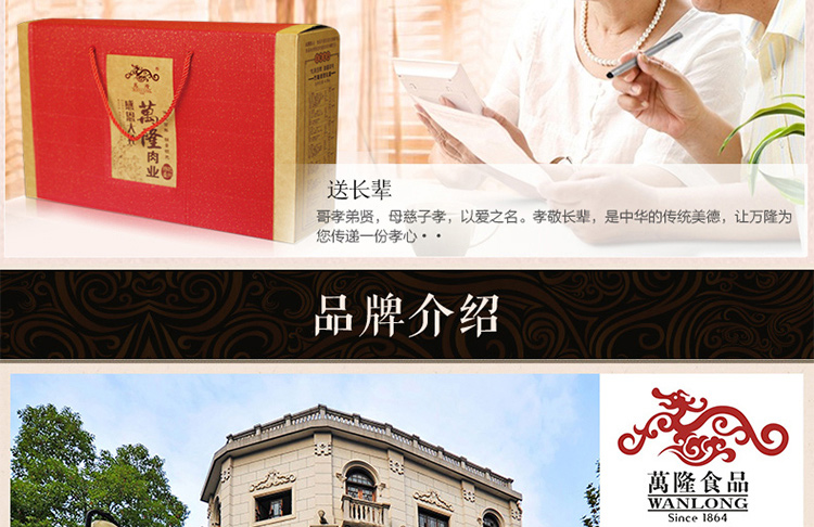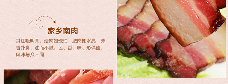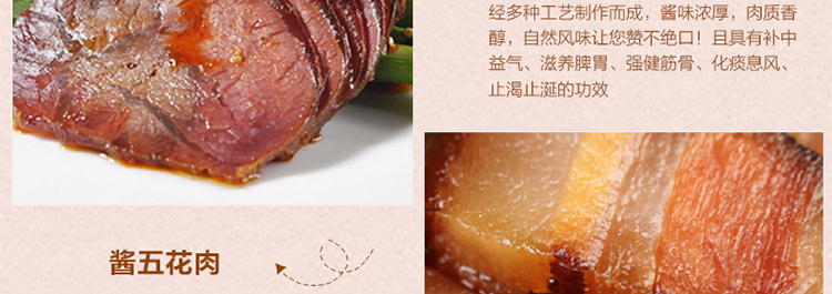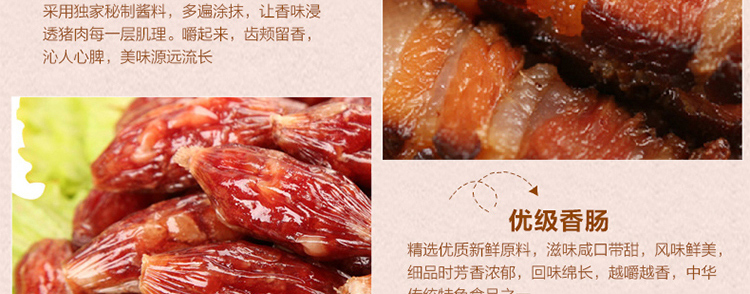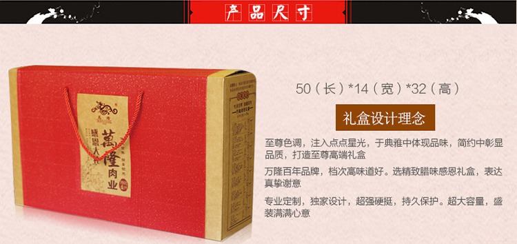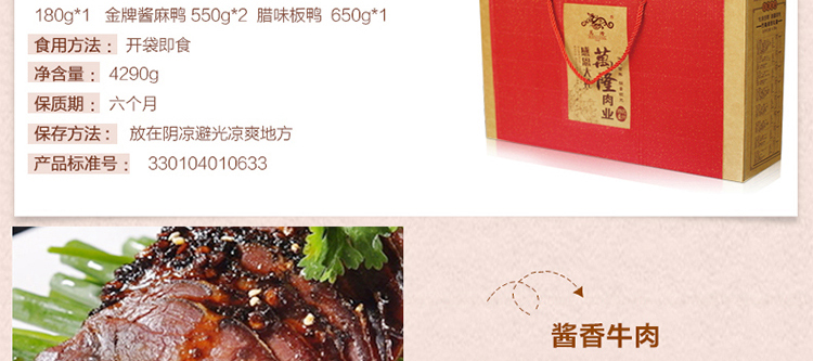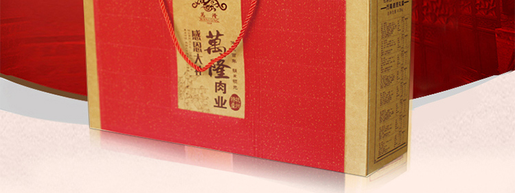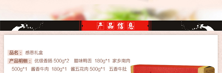 礼品盒包含:优级香肠500g*2+家乡南肉500g*1+酱五花肉500g*1+金牌酱麻鸭550g*2
