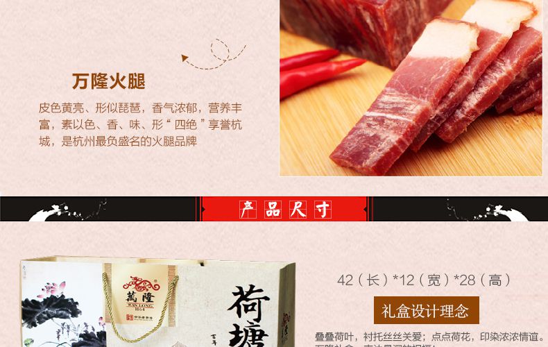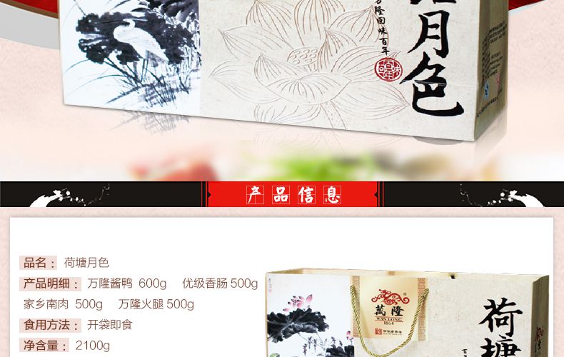 礼盒内含:600克盐水鸭,200克麻辣香肠排,万隆酱鸭600g,优质香肠500g,万隆火腿500g