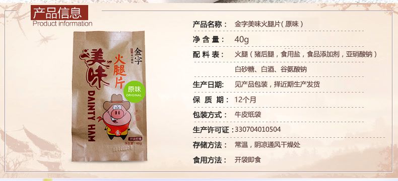 【金字】金华特产 休闲零食肉片 即食火腿片40g 原味