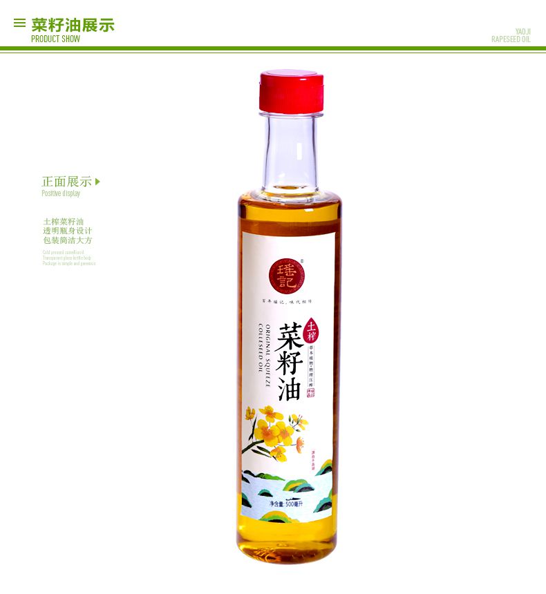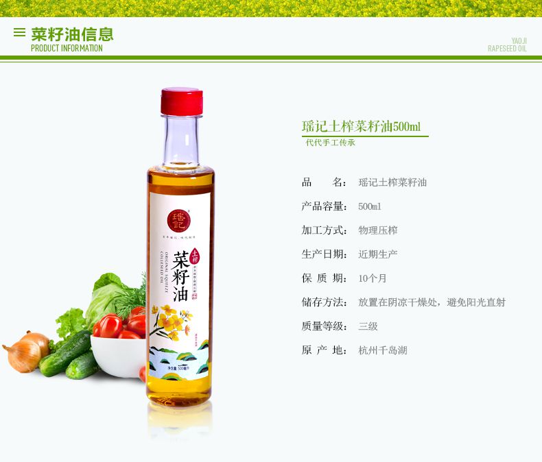 【瑶记】杭州特产 农家土榨菜籽油500ml